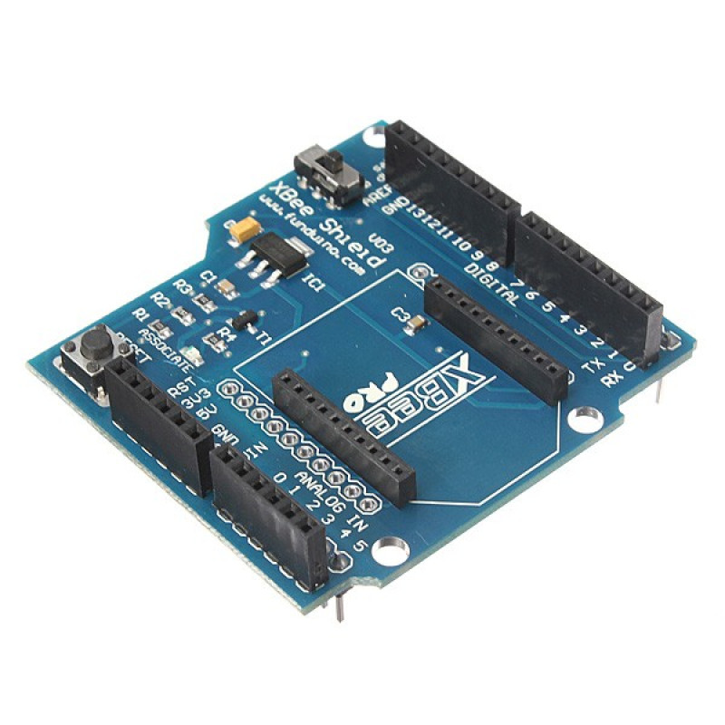 - This shield V03 can achieve a simple two crunodal ZigBee network, achieve wireless communication between Arduino, and allows the Arduino to wireless communicate over a modified ZigBee protocol using the popular XBee module.